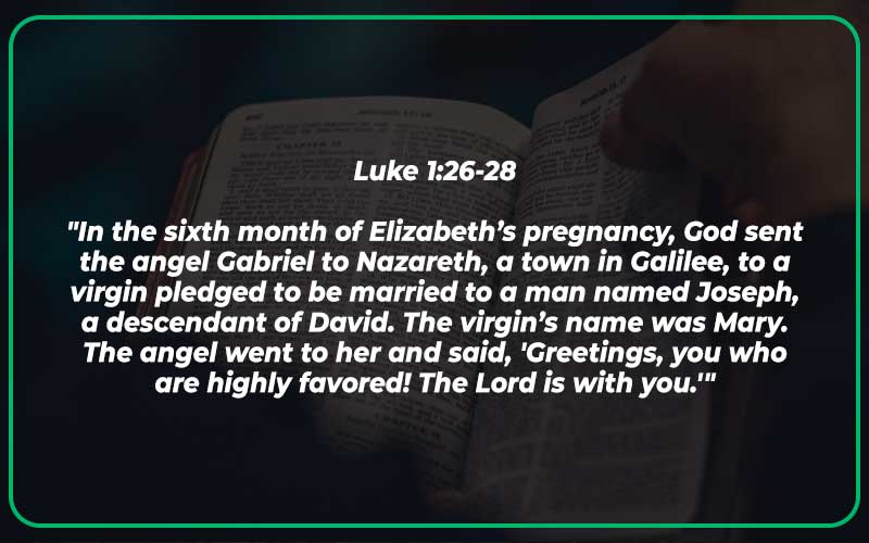 “In the sixth month of Elizabeth’s pregnancy, God sent the angel Gabriel to Nazareth, a town in Galilee, to a virgin pledged to be married to a man named Joseph, a descendant of David. The virgin’s name was Mary. The angel went to her and said, ‘Greetings, you who are highly favored! The Lord is with you.'”