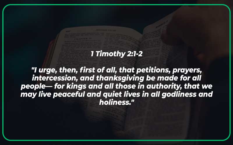 This verse encourages us to pray for those in authority, including kings, rulers, and leaders. Through our prayers, we can seek God’s guidance and wisdom for those in authority, with the ultimate goal of living peaceful and godly lives.