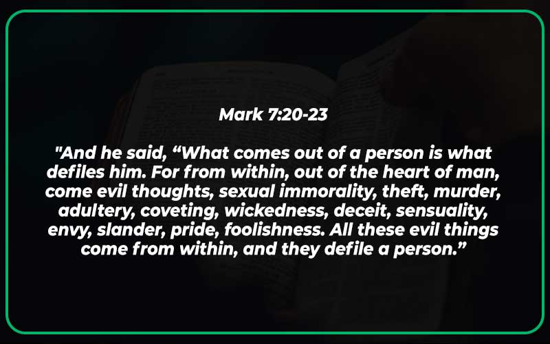 “And he said, “What comes out of a person is what defiles him. For from within, out of the heart of man, come evil thoughts, sexual immorality, theft, murder, adultery, coveting, wickedness, deceit, sensuality, envy, slander, pride, foolishness. All these evil things come from within, and they defile a person.”