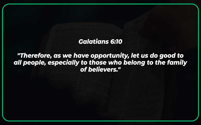 This verse challenges us to care for all people, but especially those in the family of believers. It emphasizes the importance of living out our faith by doing good and caring for others, and encourages us to look for opportunities to love and serve those around us.